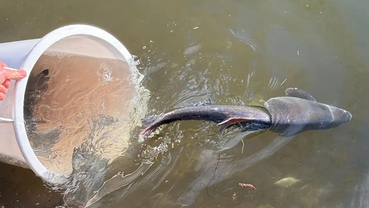 - Transportbehälter wurden zunächst auf der Wasseroberfläche des Teiches platziert, um einen langsamen, natürlichen Temperaturangleich zu ermöglichen.