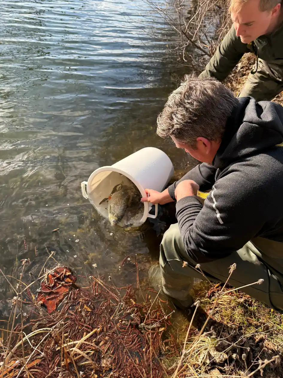 Das Einsetzen der Fische erfolgte ausschließlich durch schonende Übergabe direkt vom Transportbehälter ins Gewässer – bodennah, ruhig und ohne Einwerfen aus großer Höhe. Die Fische wurden möglichst im flachen Uferbereich entlassen und hatten die Möglichkeit, selbstständig in ihr neues Habitat einzuziehen.